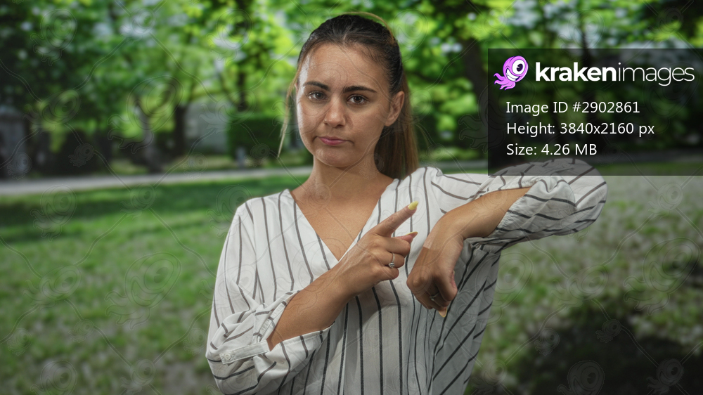 Woman with ponytail points finger to her bare wrist in forest park setting, indicating time and checking gesture with yellow fingernails; impatience.