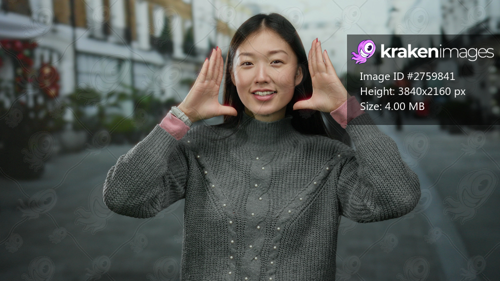Woman poses creatively on urban street capturing self framing gesture outdoors in city.