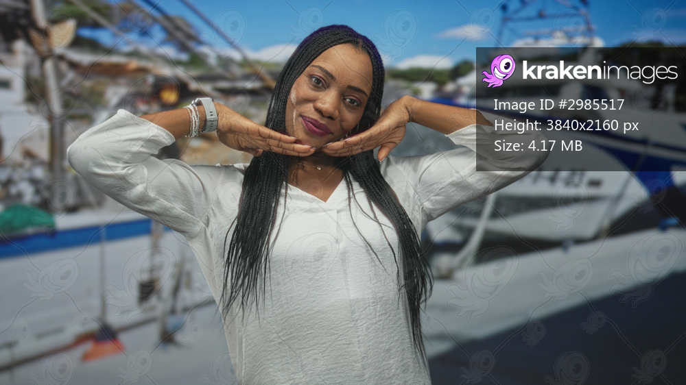Woman poses with hands framing her chin, smiling in a white blouse with bracelet and necklace before a yacht backdrop in a studio; playful joy.