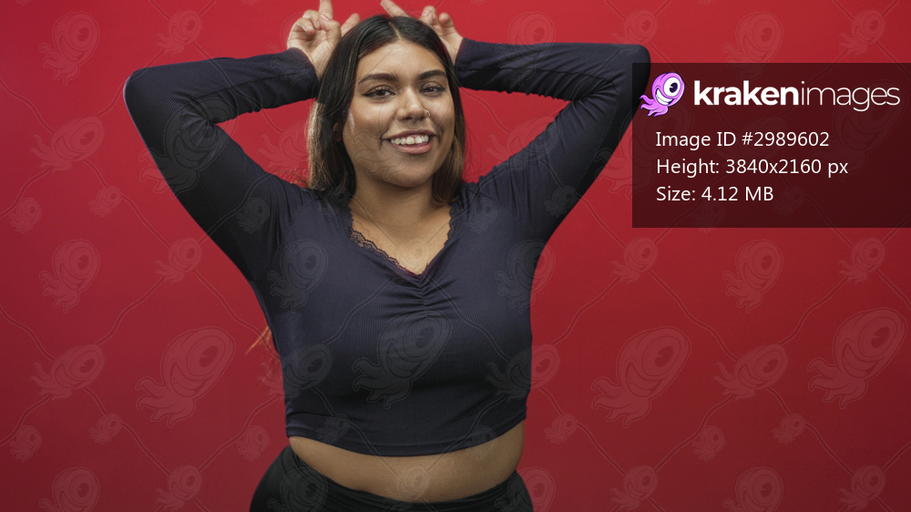 Woman poses making bunny ears with fingers behind head, midriff exposed in studio; playful confidence.