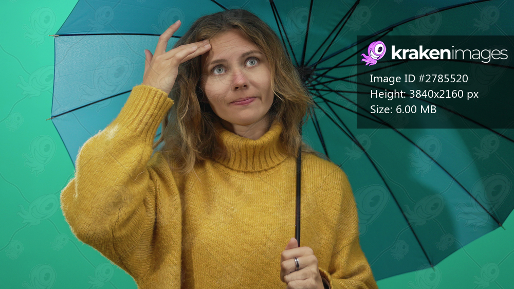 Woman poses with umbrella in a surprise studio scene as a blonde young subject in cozy sweater touches her forehead with a raised hand against a green backdrop. - Kraken Images