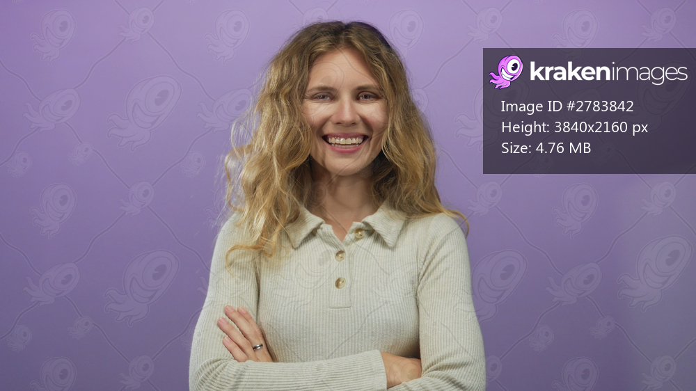 Woman posing with arms crossed in studio radiates blonde young smiling charm in purple portrait casual setup.