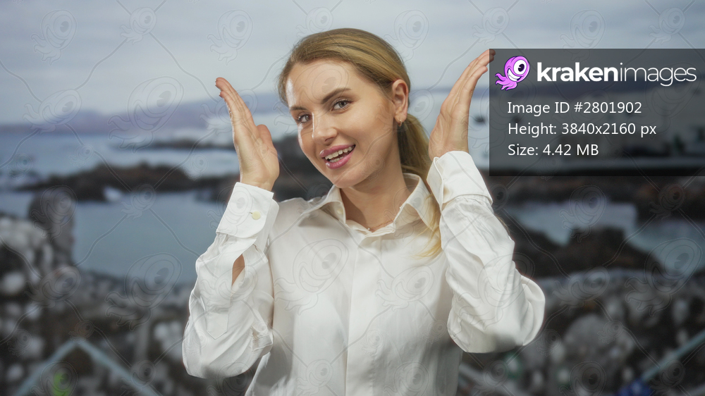 Woman posing at seaside beach with white buildings in the background, wearing a white shirt, smiling and embracing the outdoor coastal atmosphere in daylight. - Kraken Images