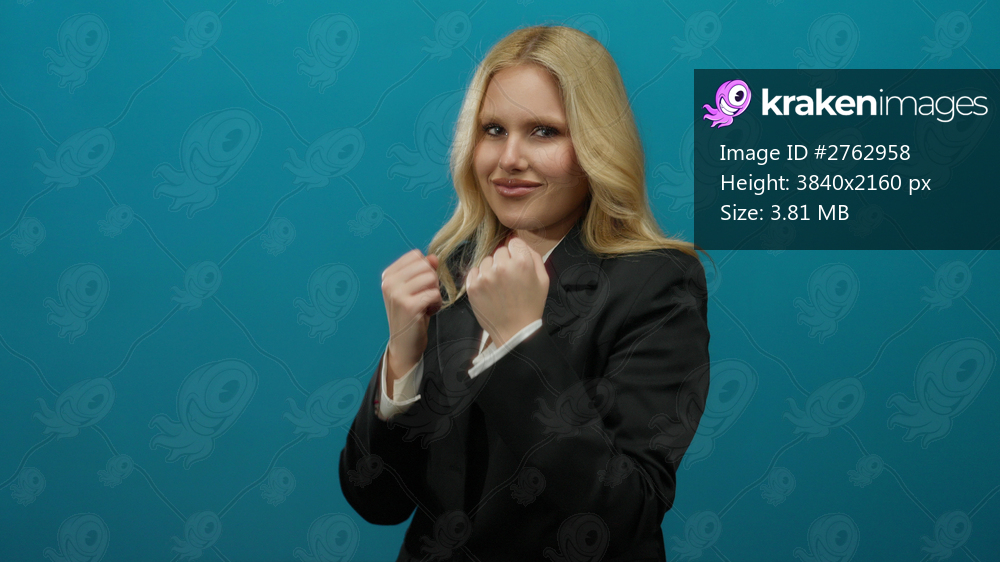 Woman posing confidently in a suit against a bold blue background, embodying strength and determination.