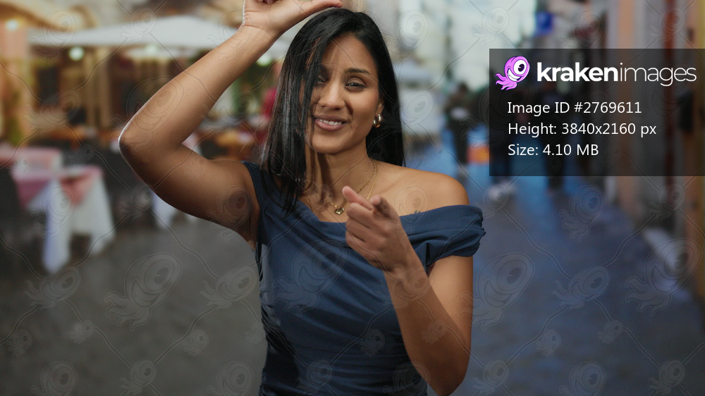 Woman posing confidently outdoors at a restaurant terrace, dressed elegantly with street background showcasing urban life.
