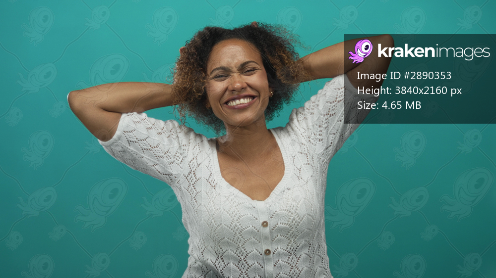 Woman posing with hands behind head revealing shoulders and warm smile against teal studio backdrop; playful confidence.