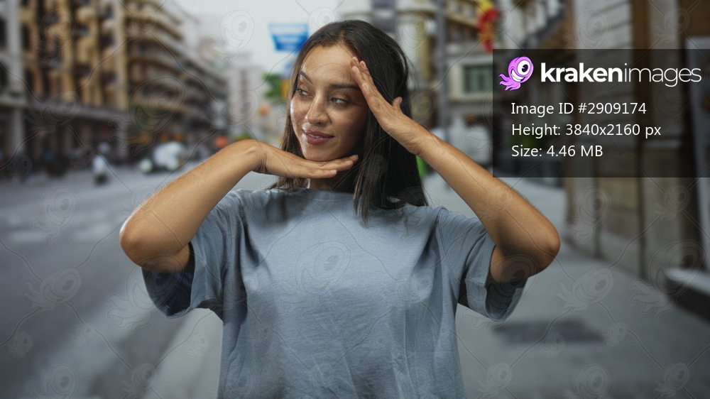 Woman posing with hands framing face, smiling in a casual tshirt on a busy street in city center; playful confidence.
