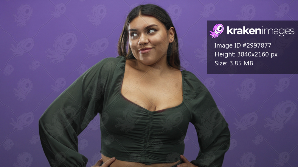 Woman posing with hands on hips showing cleavage wearing green top and smiling against purple backdrop in studio; confidence empowerment.