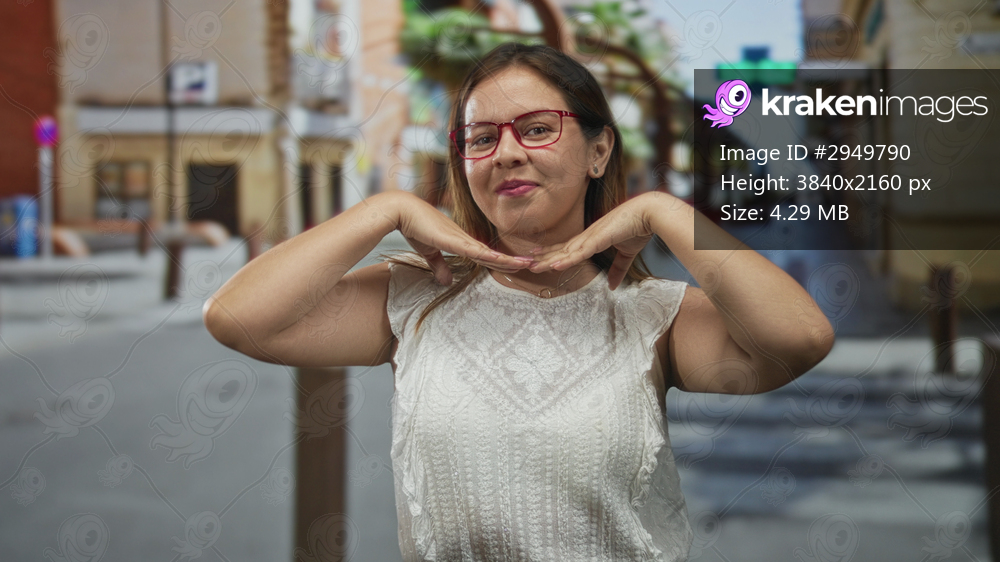 Woman posing with hands under chin and smiling on a street in the city, wearing red glasses and a white lace blouse; playful joy.