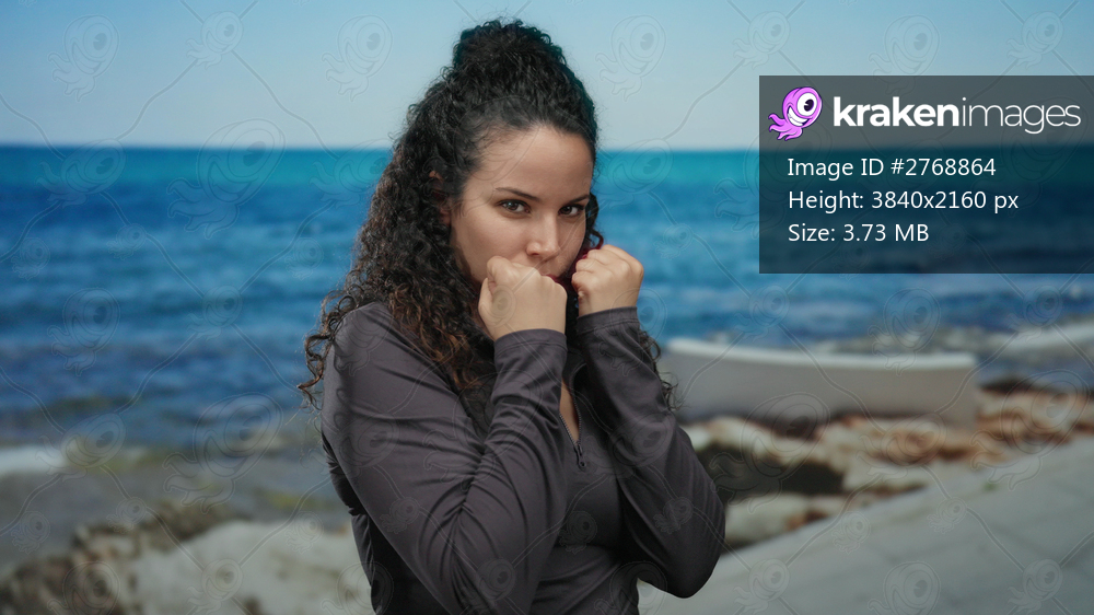 Woman posing in a defensive stance on a beach promenade with the sea in the background, highlighting her youthful energy and hispanic heritage in a picturesque outdoor setting. - Kraken Images