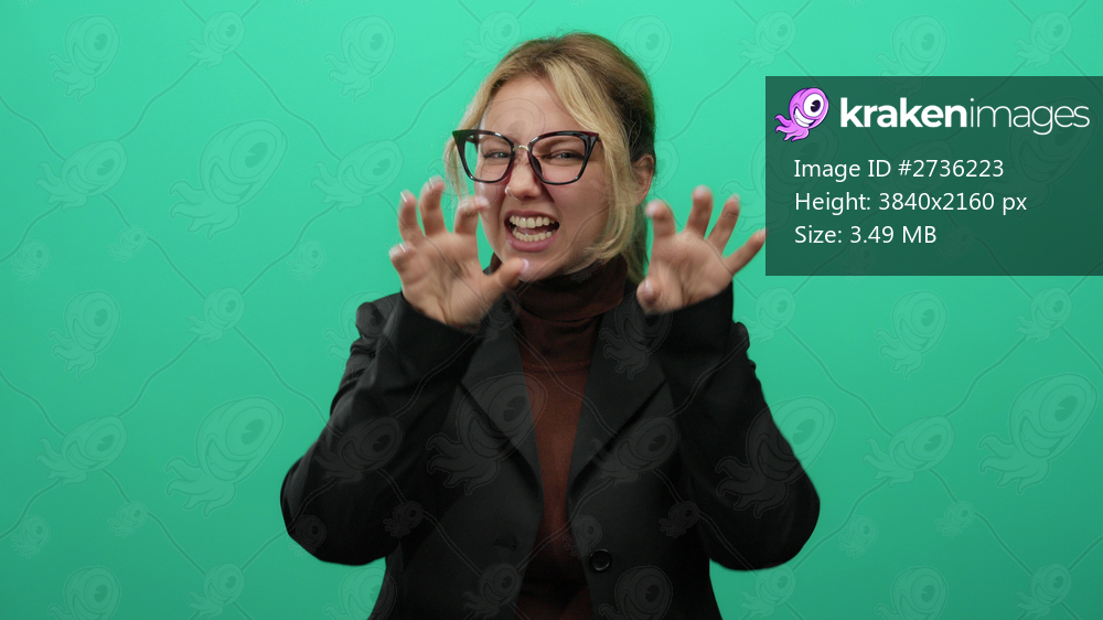 Woman posing in black suit with fun gesture over green background shows expressive personality and playful nature.