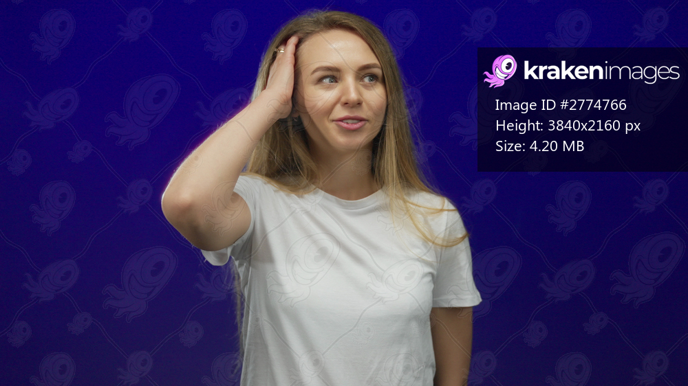 Woman posing in front of an isolated blue background in a casual white shirt, exuding confidence and ease with a gentle smile.