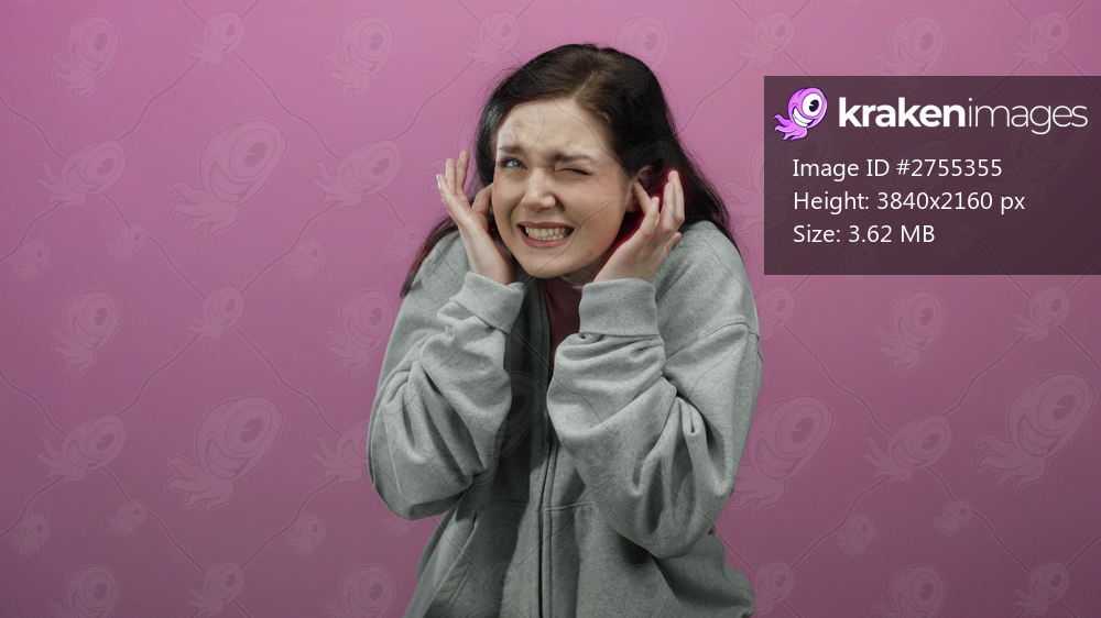Woman posing in gray hoodie with an expressive face against a vibrant pink background, showcasing her casual style and brunette hair.