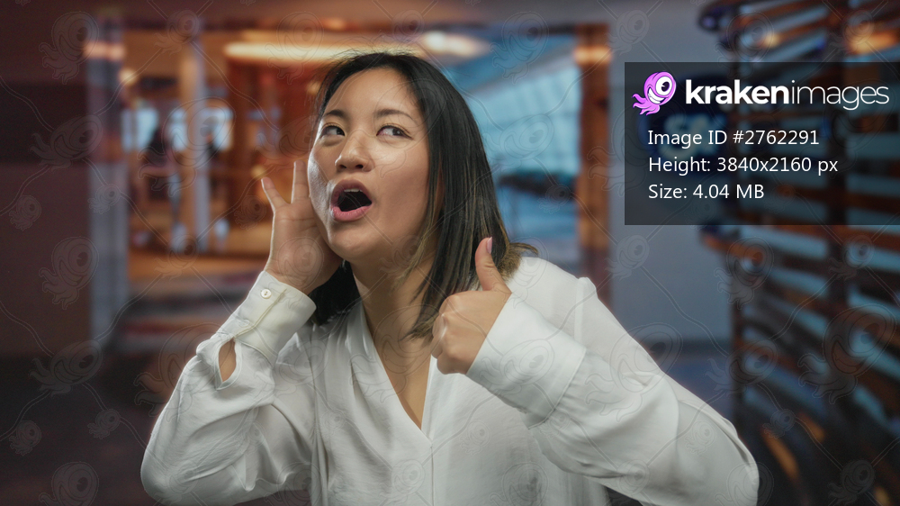 Woman posing indoors hotel mimicking gestures in stylish white shirt with playful expressions in modern lounge area.
