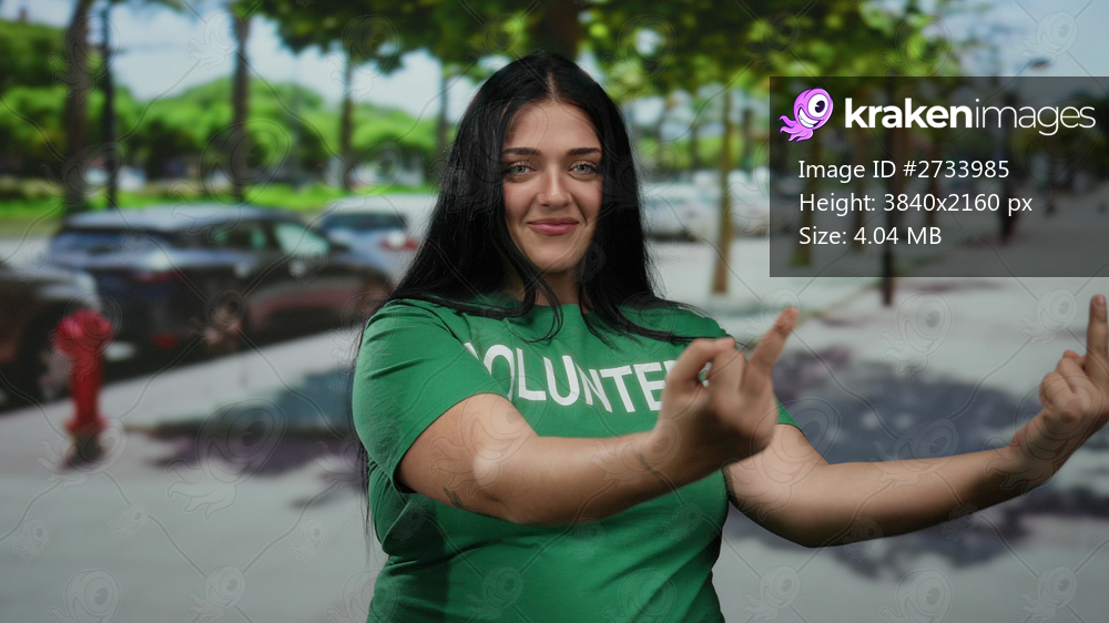 Woman posing on busy city street wearing green volunteer shirt making expressive hand gesture, showcasing modern urban life dynamics.