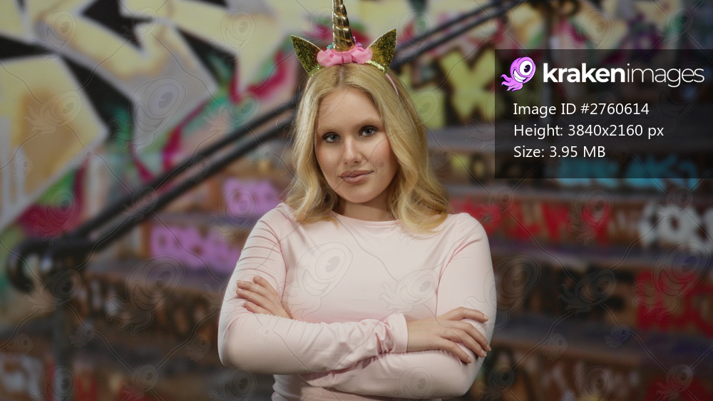 Woman posing outdoors in city wearing unicorn diadem with graffiti background conveys fun and whimsy, blonde hair and pink attire enhancing playful street atmosphere. - Kraken Images