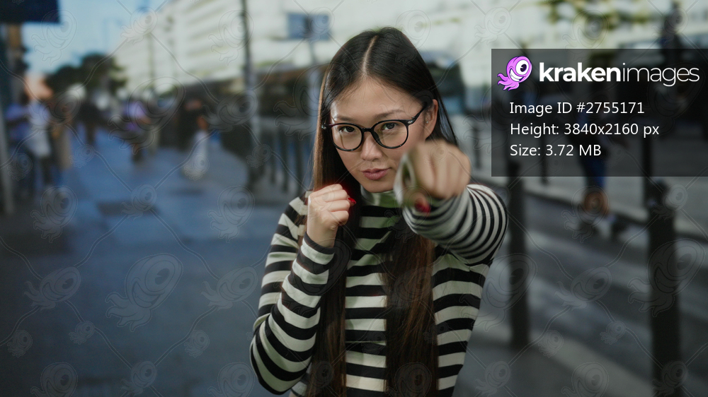 Woman posing playfully with fists on busy urban street wearing striped shirt in city setting during sunny day