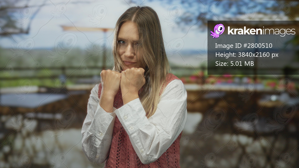 Woman posing playfully in a fighting stance on an outdoor terrace restaurant with blurred city view, showcasing youthful energy and casual style.