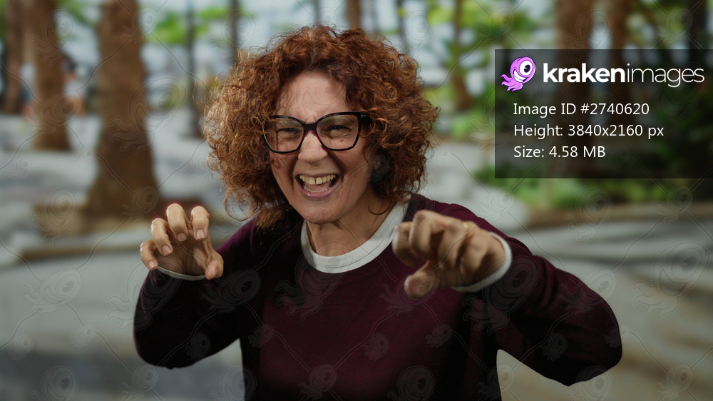 Woman posing playfully in a sunlit park with trees in the background, wearing glasses and a burgundy sweater, expressing joy and happiness outdoors.