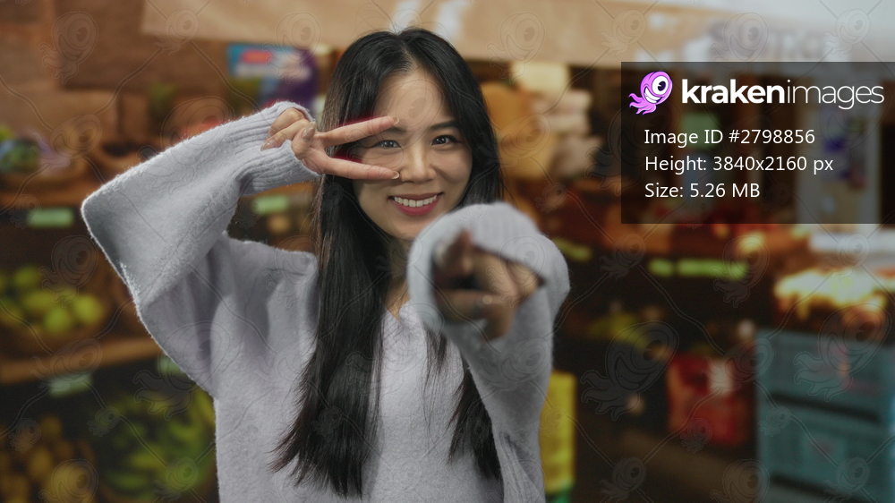 Woman posing playfully with peace sign and pointing in an outdoor market with fruit display in the background, exuding happiness and confidence.