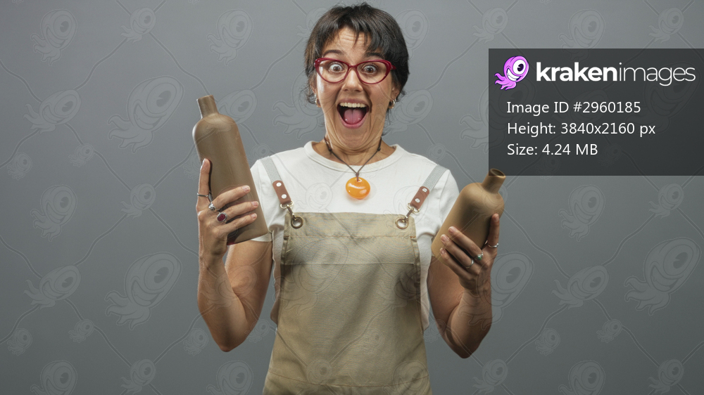 Woman potter holding two pottery bottles with hands raised, smiling and wearing apron in studio; joyful surprise.