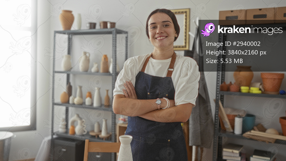 Woman potter in apron with arms crossed beside pottery shelves and ceramic vase on table in studio; craft pride skill.