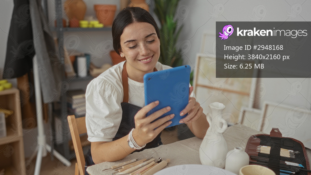 Woman potter in apron holds bright blue tablet with both hands and smiles at the screen surrounded by clay tools in studio; calm learning.