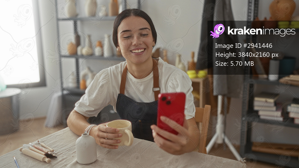 Woman potter in apron smiles while holding ceramic mug and checks red smartphone in studio workspace; creative joy.