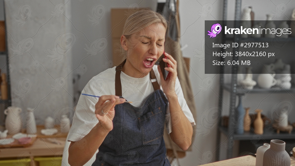 Woman potter on phone gestures with hand in studio while holding a brush and wearing an apron; frustration urgency.