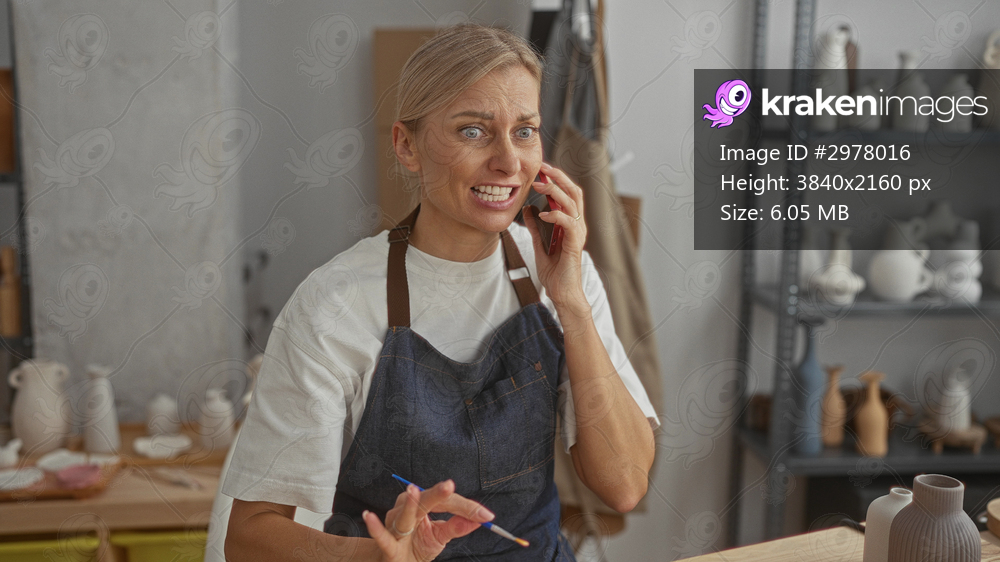 Woman potter on phone gestures with hand in studio while holding a brush and wearing an apron; frustration urgency.