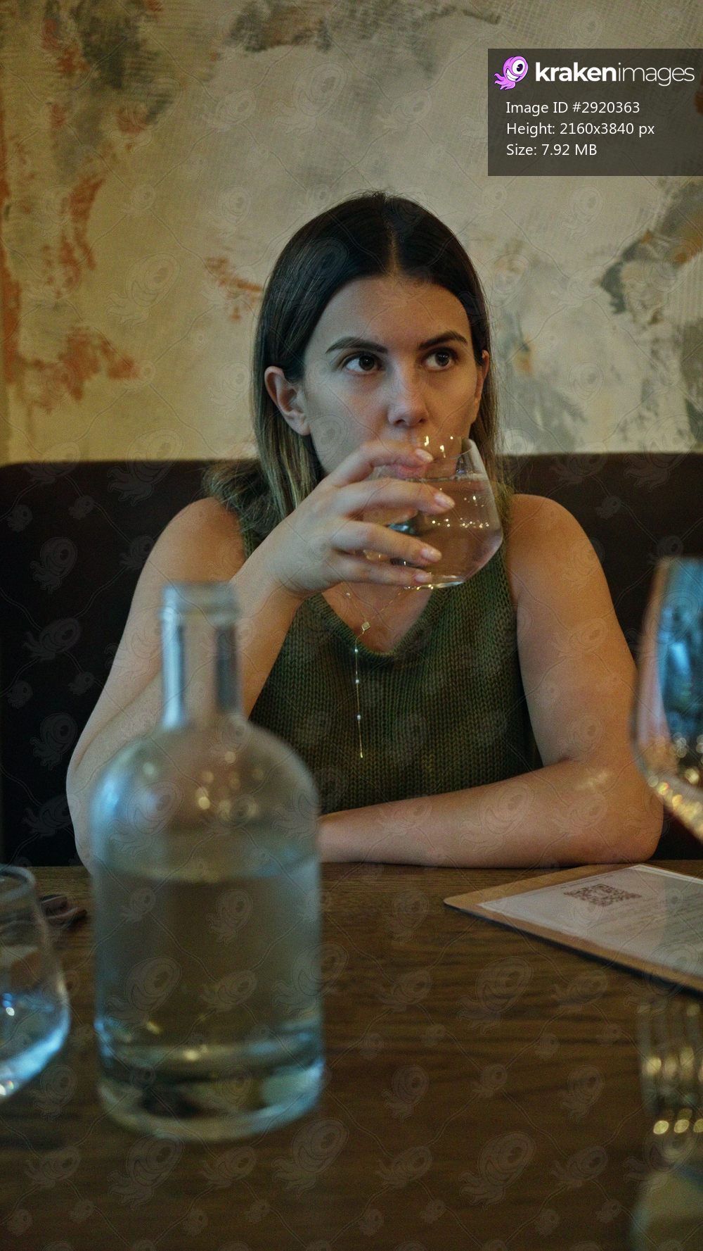 Woman pours water from bottle into a stemless glass at a restaurant table inside a building, hand steady and focused on the glass; calm contemplation.