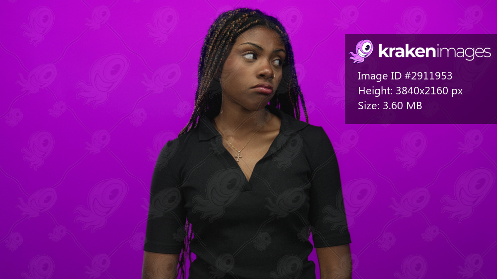 Woman with pouting expression and sideways glance, braided hair, cross necklace and exposed neck in magenta studio; skepticism.