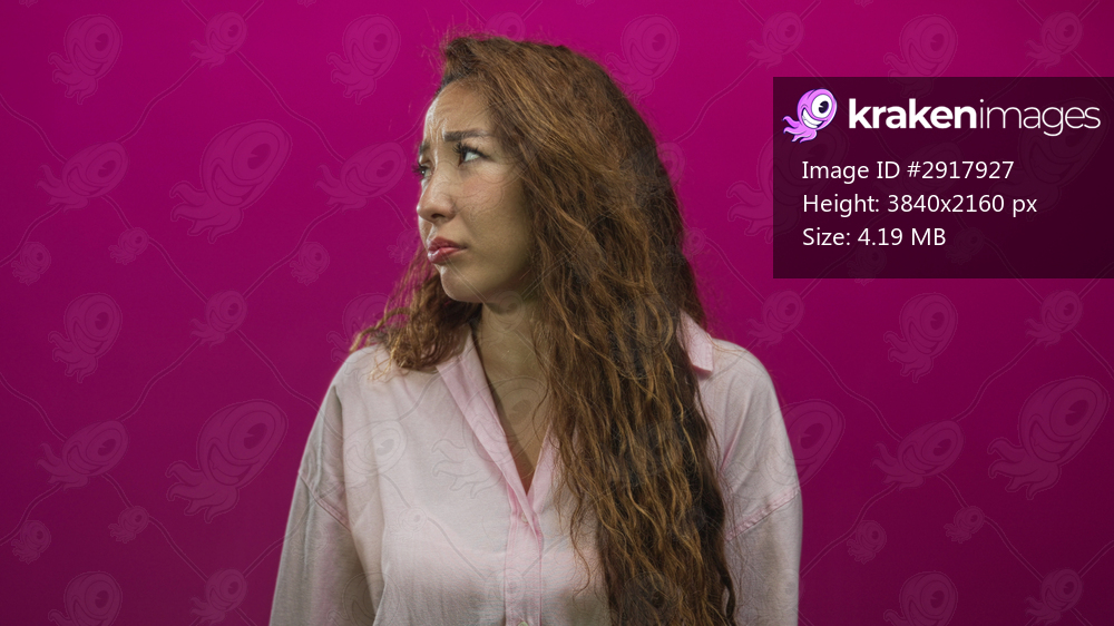 Woman with pouting face, furrowed brow and long wavy hair in magenta studio wearing pale pink shirt and looking sideways; quiet sadness.