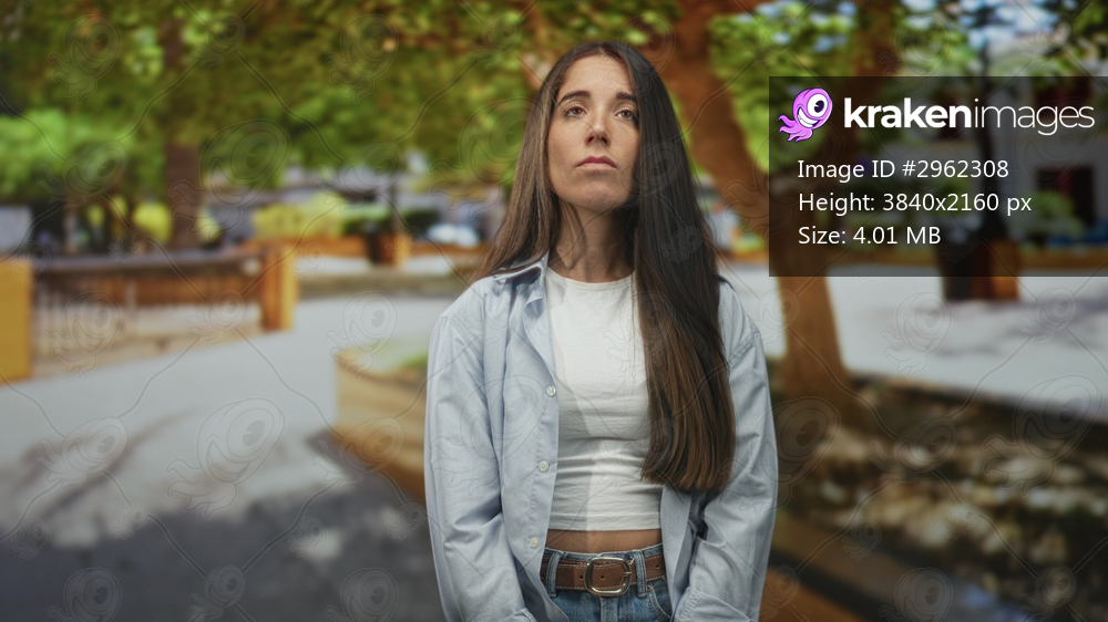 Woman pouting with hands clasped and visible midriff in a casual shirt and jeans on a street lined with trees and benches; resignation disappointment.