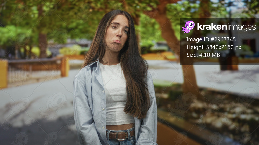 Woman pouting with hands clasped and visible midriff in a casual shirt and jeans on a street lined with trees and benches; resignation disappointment.