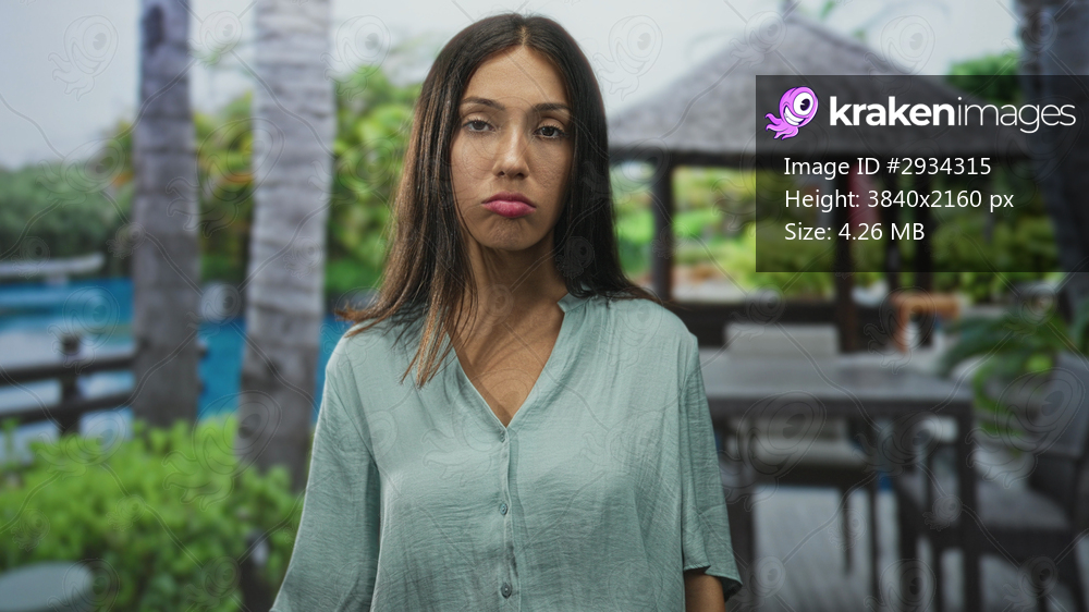 Woman pouting lips with closed eyes at hotel pool, wearing loose blouse by cabana; quiet disappointment.
