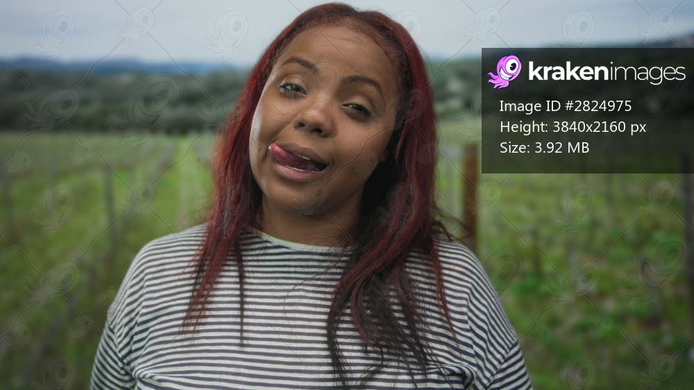 Woman with pouting lips in forest wearing striped shirt and red hair among green vines in a closeup shot; fun.