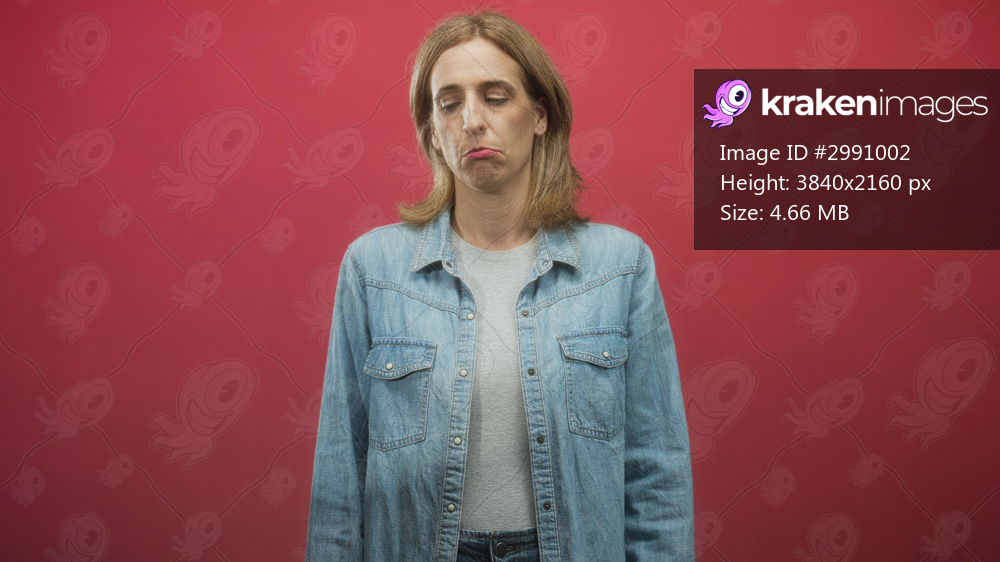 Woman pouting mouth with head tilt and slumped shoulders in studio red wall, denim shirt; quiet disappointment.