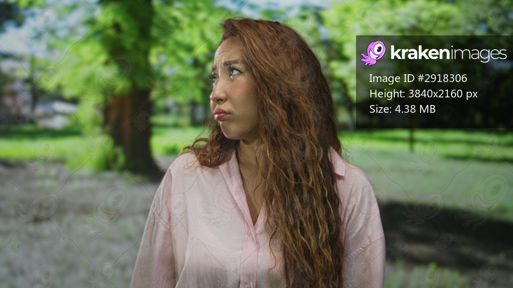 Woman pouting with pursed lips and furrowed brow in forest park setting wearing light pink shirt, long hair visible; sadness solitude.