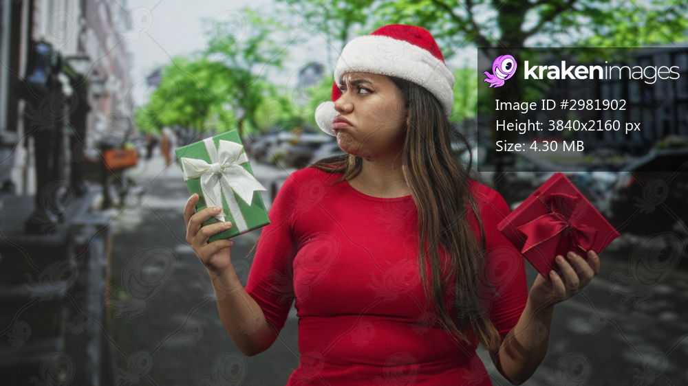Woman pouting while holding green and red wrapped gifts in hands on street wearing santa hat and red shirt; holiday indecision disappointment.