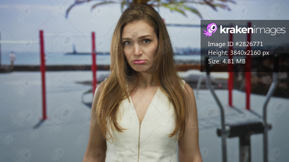 Woman pouts glossy lips in white sleeveless top at gym pullup bar amid metal workout equipment; sadness.