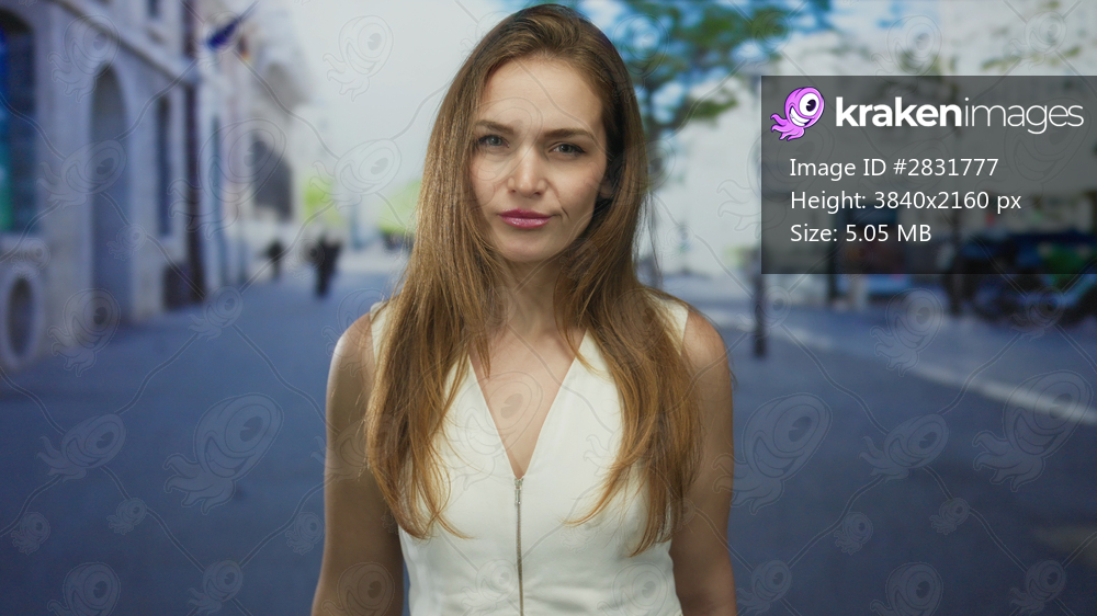 Woman pouts lips on city street with white top and long brown hair framing her face under daylight; playfulness.