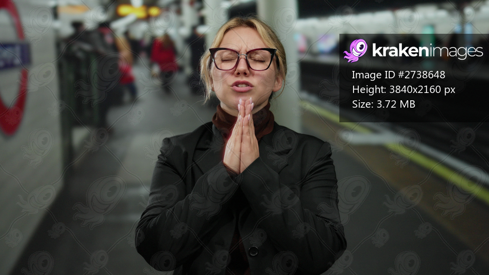 Woman praying at busy train station with glasses in focus, conveying concentration and hope on an indoor railway platform amid commuters.