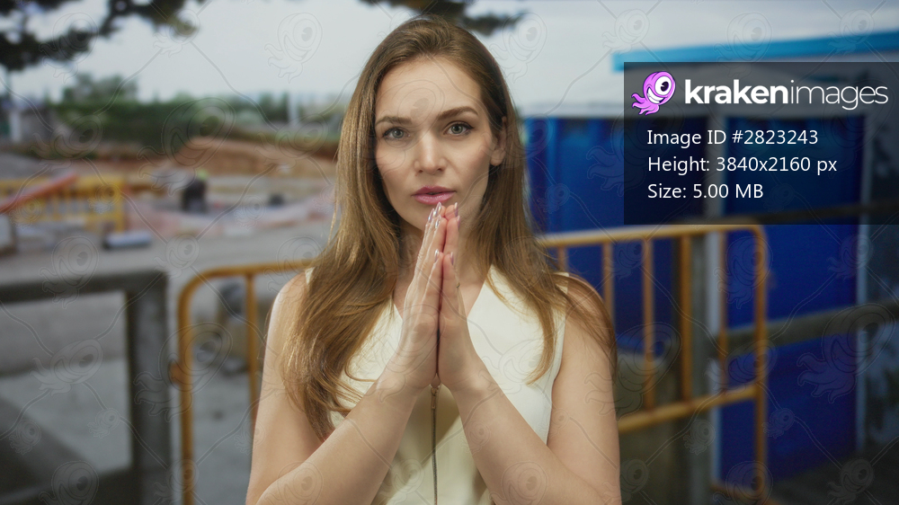 Woman praying with clasped hands and closed eyes in white vest at outdoor construction site; serenity.