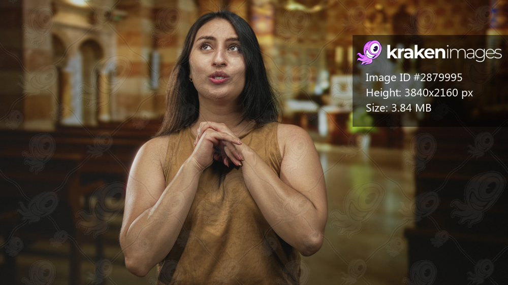 Woman praying with clasped hands in church building, smiling and looking upward; devotion faith hope.