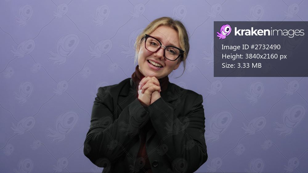 Woman praying with clasped hands in front of a purple wall wearing glasses and a black suit, demonstrating emotion and hope in an isolated setting.