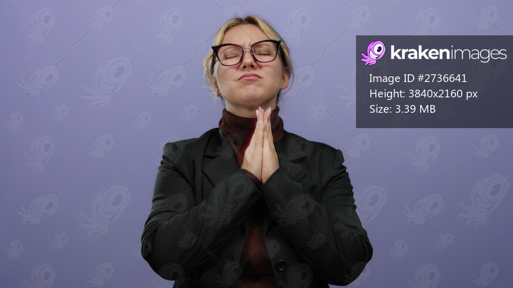 Woman praying with clasped hands in front of a purple wall wearing glasses and a black suit, demonstrating emotion and hope in an isolated setting.