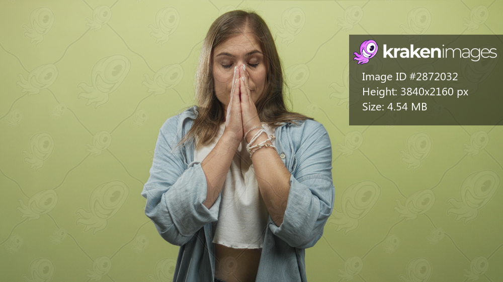 Woman praying with clasped hands in green studio setting, eyes closed and bracelets visible on her wrist; serenity.