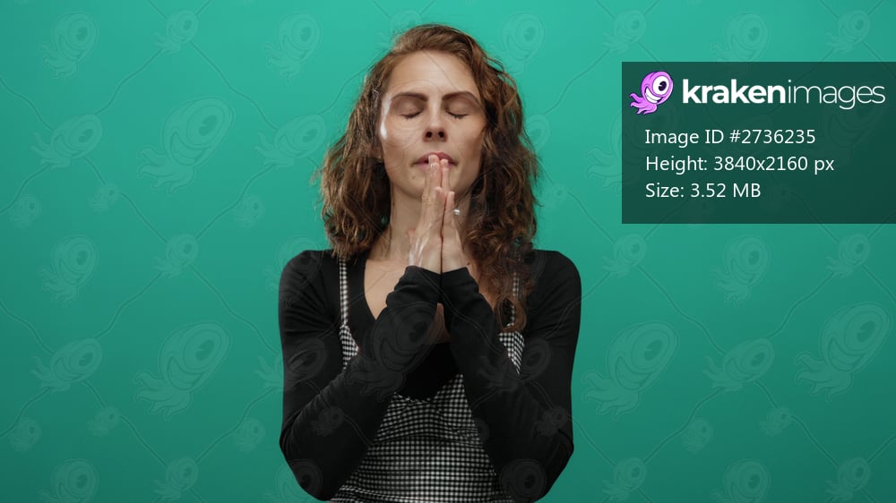 Woman praying with closed eyes against green background wall implying introspection and solitude in a serene setting encompassing mindfulness and youthful tranquility. - Kraken Images