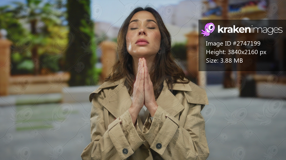Woman praying with closed eyes in a city street, surrounded by blurred urban setting and greenery, embodying tranquility and focus.